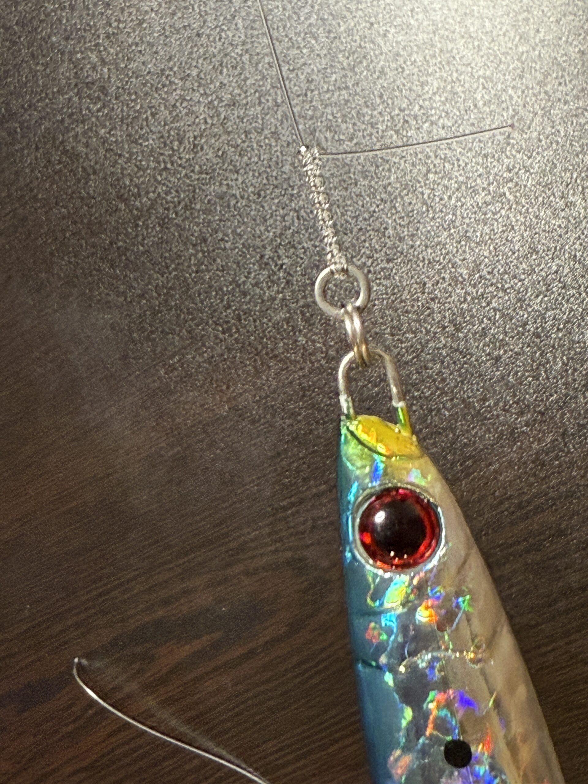 リーダーとジグ(スプリットリング)を結ぶときに使う強力な結び方です。